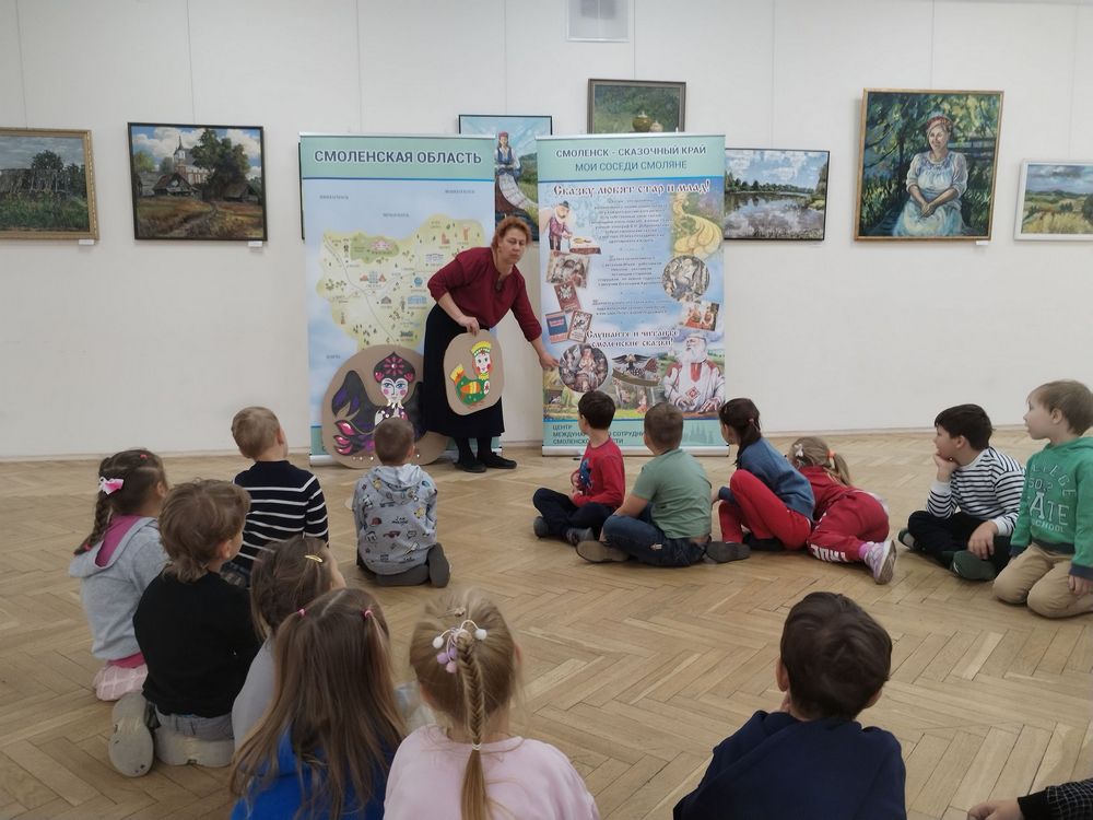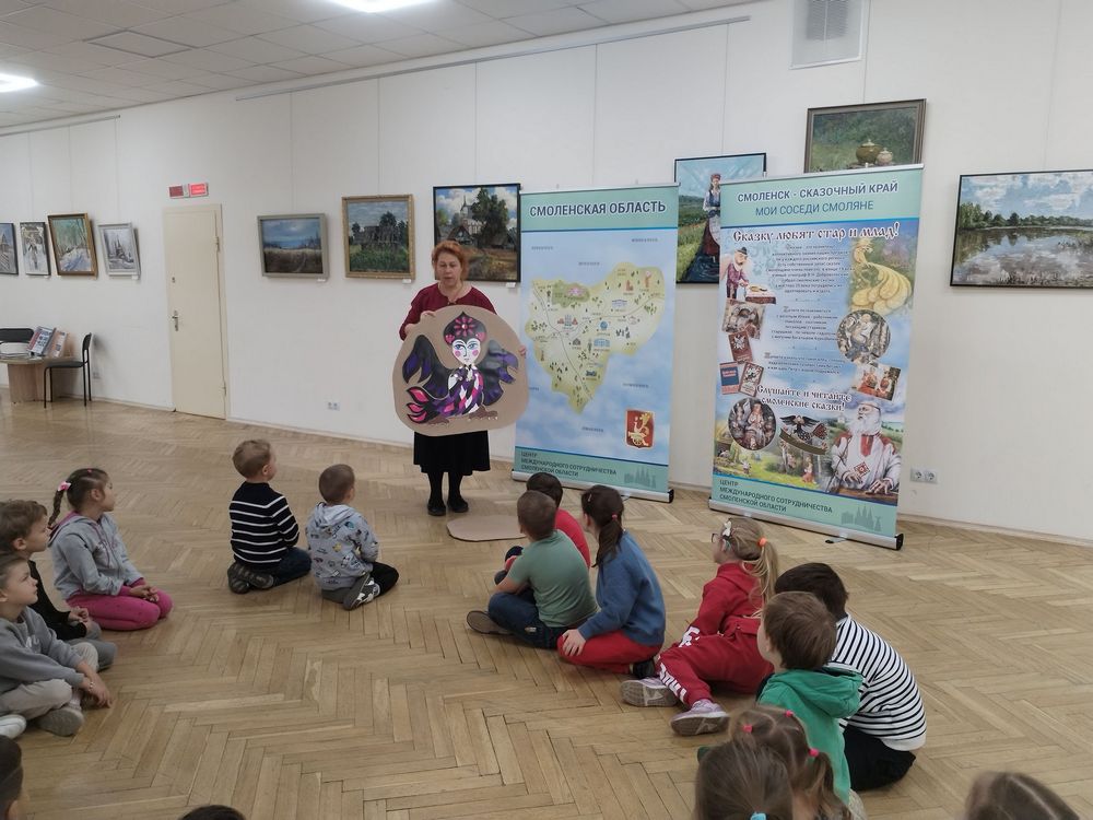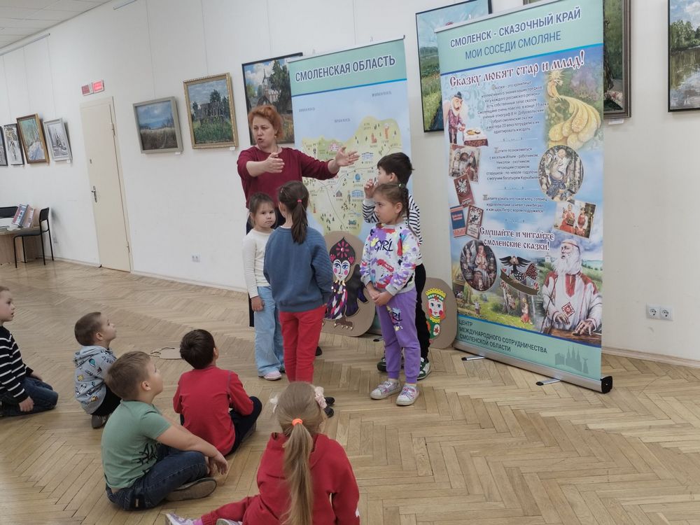 Специальным гостем стала начальник отдела культурного и экономического сотрудничества Центра международного сотрудничества Смоленской области Наталья Николаевна Ушкова. В самом начале встречи ребята сделали разминку. Затем Наталья Николаевна познакомила малышей с удивительным миром сказок. Детишки с удовольствием слушали и открывали для себя новых сказочных героев. Они узнали о птице Гамаюн и её странствиях, о Жар-птице и месте её обитания. После умственной нагрузки малыши разбились по парам и стали играть в «Шишки и орешки».