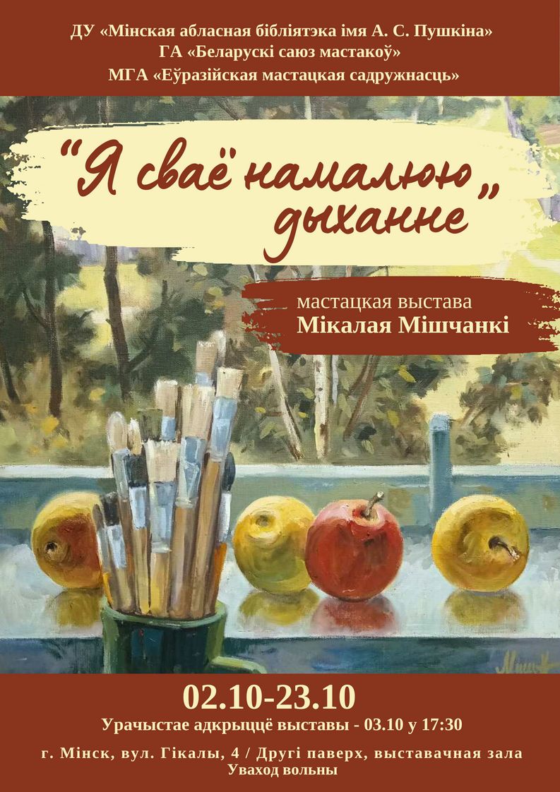 Адкрыццё персанальнай выставы «Я сваё намалюю дыханне» Мікалая Мішчанкі адбудзецца 3 кастрычніка 2025 года ў 17:30 у Мінскай абласной бібліятэцы імя А.С. Пушкіна па вул. Гікалы, 4 (другі паверх, выставачная зала). Уваход вольны.