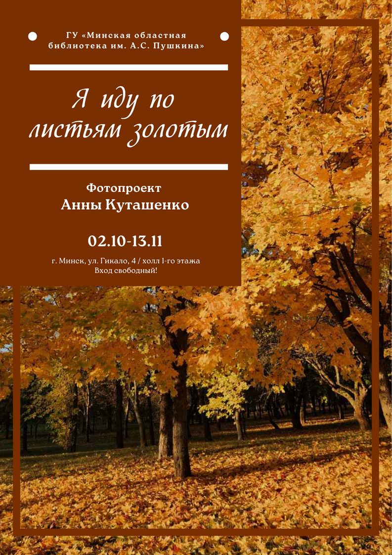 Персональный фотопроект «Я иду по листьям золотым» Анны Куташенко экспонируется в период со 2 октября по 11 ноября 2025 года в Минской областной библиотеке имени А.С. Пушкина по адресу: ул. Гикало, 4 (холл первого этажа). Вход свободный.