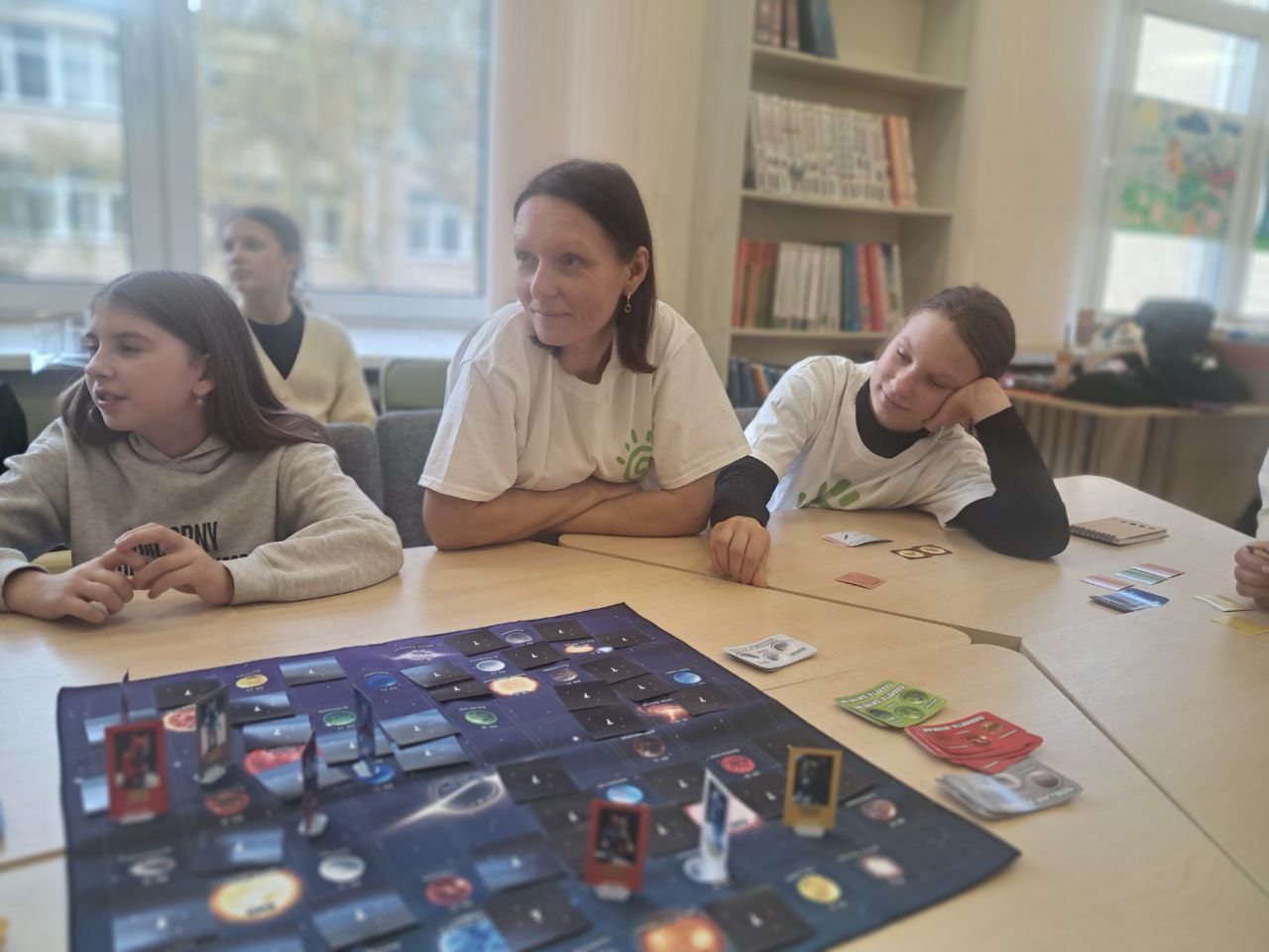 Ребята с родителями с огромным удовольствием играли в настольную игру «Астрокотики»(8+).