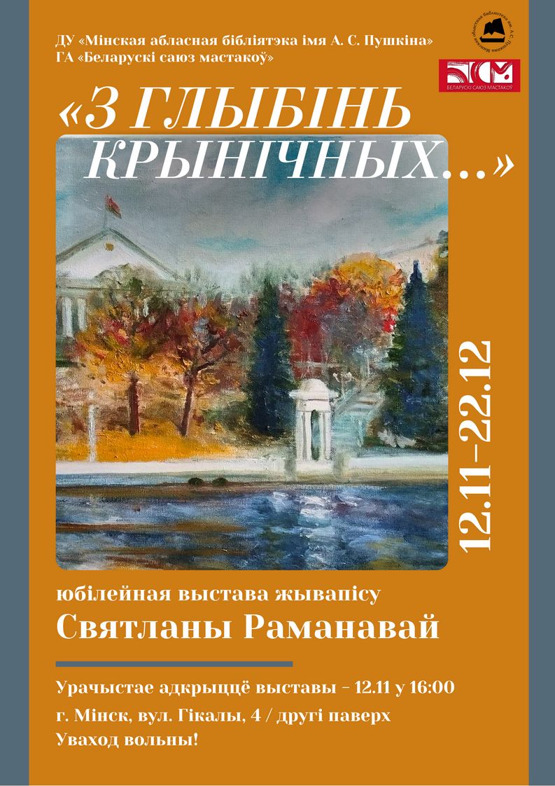 Урачыстае адкрыццё юбілейнай выставы жывапісу Святланы Раманавай «З глыбінь крынічных…» адбудзецца 12 лістапада 2025 года ў 16:00 у Мінскай абласной бібліятэцы імя А.С. Пушкіна па адрасе: вул. Гікалы, 4 (другі паверх). Уваход вольны.
