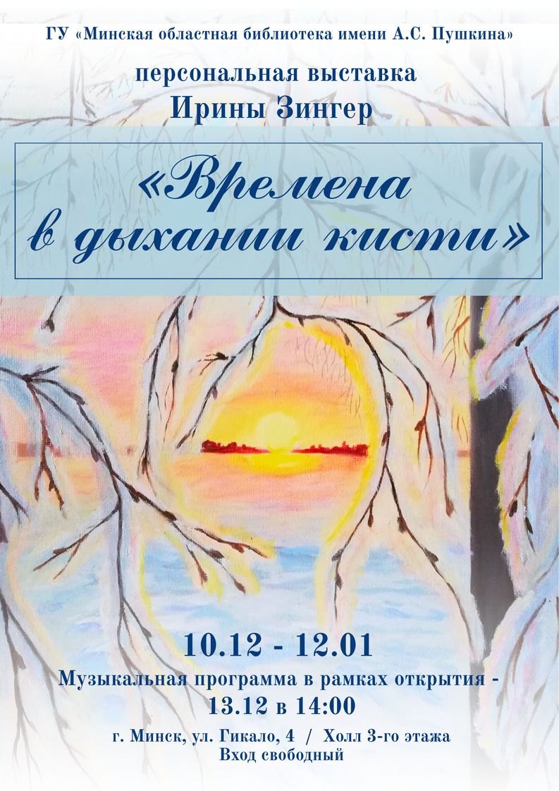 Минская областная библиотека имени А.С. Пушкина приглашает своих постоянных читателей и гостей познакомиться с персональной выставкой живописи белорусской художницы Ирины Зингер «Времена в дыхании кисти».