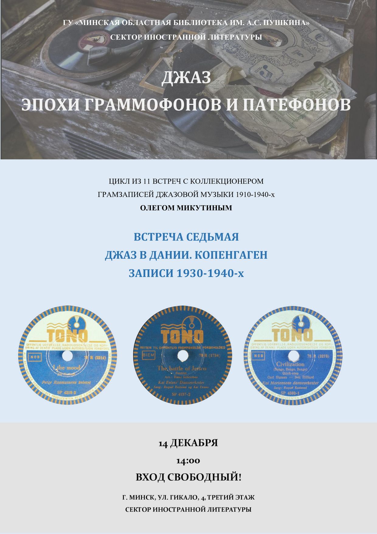 В воскресенье, 14 декабря в 14:00 в секторе иностранной литературы состоится седьмая встреча из цикла о традиционном джазе. С коллекционером грамзаписей Олегом Микутиным мы поговорим о джазе в Дании – стране, которая почти наравне со Швецией отмечена наибольшим разнообразием джазовой сцены по сравнению с другими странами Скандинавского полуострова. Оркестры, которые могли играть исключительно джазовую музыку, по-настоящему оформились в Дании, в Копенгагене, только к 1930-м годам, джаз же в 1920-е годы существовал только в виде грампластинок из США и Англии. Именно поэтому 1920-е годы останутся почти вне нашего внимания. Более всего мы послушаем записи и поговорим о джазе 1940-х годов, поскольку именно тогда датский джаз так или иначе выходит из-под американского влияния и оформляется как таковой.