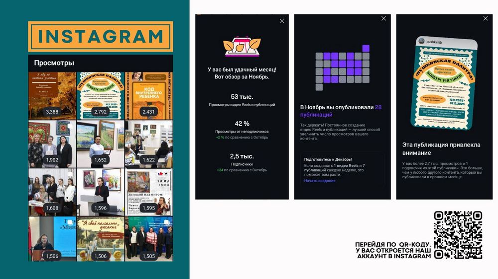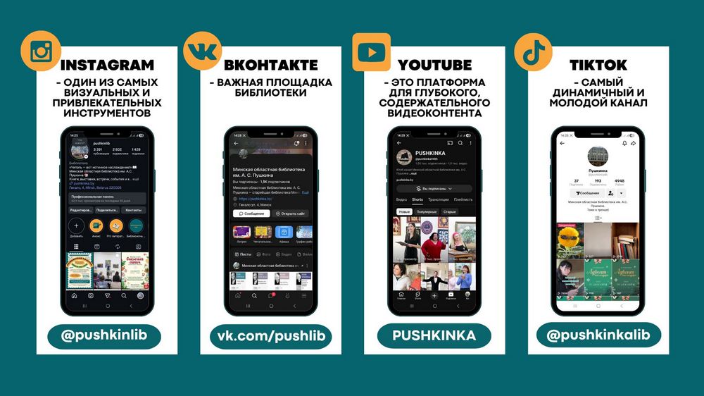 Слушатели курсов повышения квалификации библиотечных специальностей на примере Минской областной библиотеки узнали о том, какую роль играет грамотное и профессиональное ведение социальных сетей в формировании современного и привлекательного имиджа библиотеки. Алина Черноокая подробно рассказала о результатах и достижениях отдела маркетинга и социокультурной деятельности Минской областной библиотеки им. А.С. Пушкина, сотрудники которого занимаются информационным и контентным наполнением сайта библиотеки и самых востребованных интернет-площадок: «Инстаграма», социальной сети «ВКонтакте», видеохостинга «YouTube» и других. Лектор подчеркнула, что страницы библиотеки в соцсетях имеют весьма обширный охват аудитории и незаменимы в современном мире цифровых источников информации. Так, на данный момент на «Инстаграм» Пушкинки подписано более двух с половиной тысяч человек, а выкладываемый контент набирает от пятидесяти до семидесяти тысяч просмотров за месяц. Просмотры на «YouTube» также исчисляются десятками тысяч за год и продолжают неуклонно расти. Всё это и многое другое позволяет Минской областной библиотеке занимать одну из лидирующих позиций.
