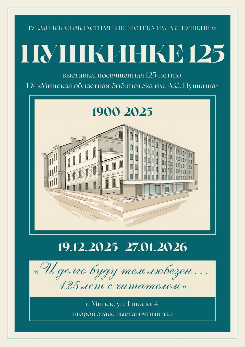 Юбилейная выставка «ПУШКИНКЕ 125», приуроченная к 125-летию Минской областной библиотеки имени А.С. Пушкина экспонируется в период с 19 декабря 2025 года по 27 января 2026 года в Минской областной библиотеке имени А.С. Пушкина по адресу: ул. Гикало, 4 (второй этаж, выставочный зал). Вход свободный.