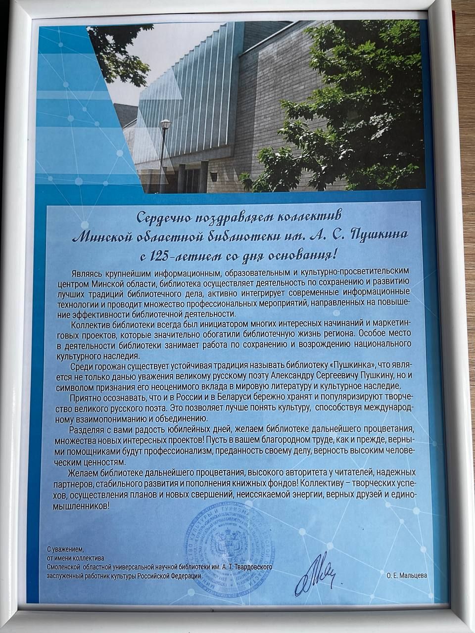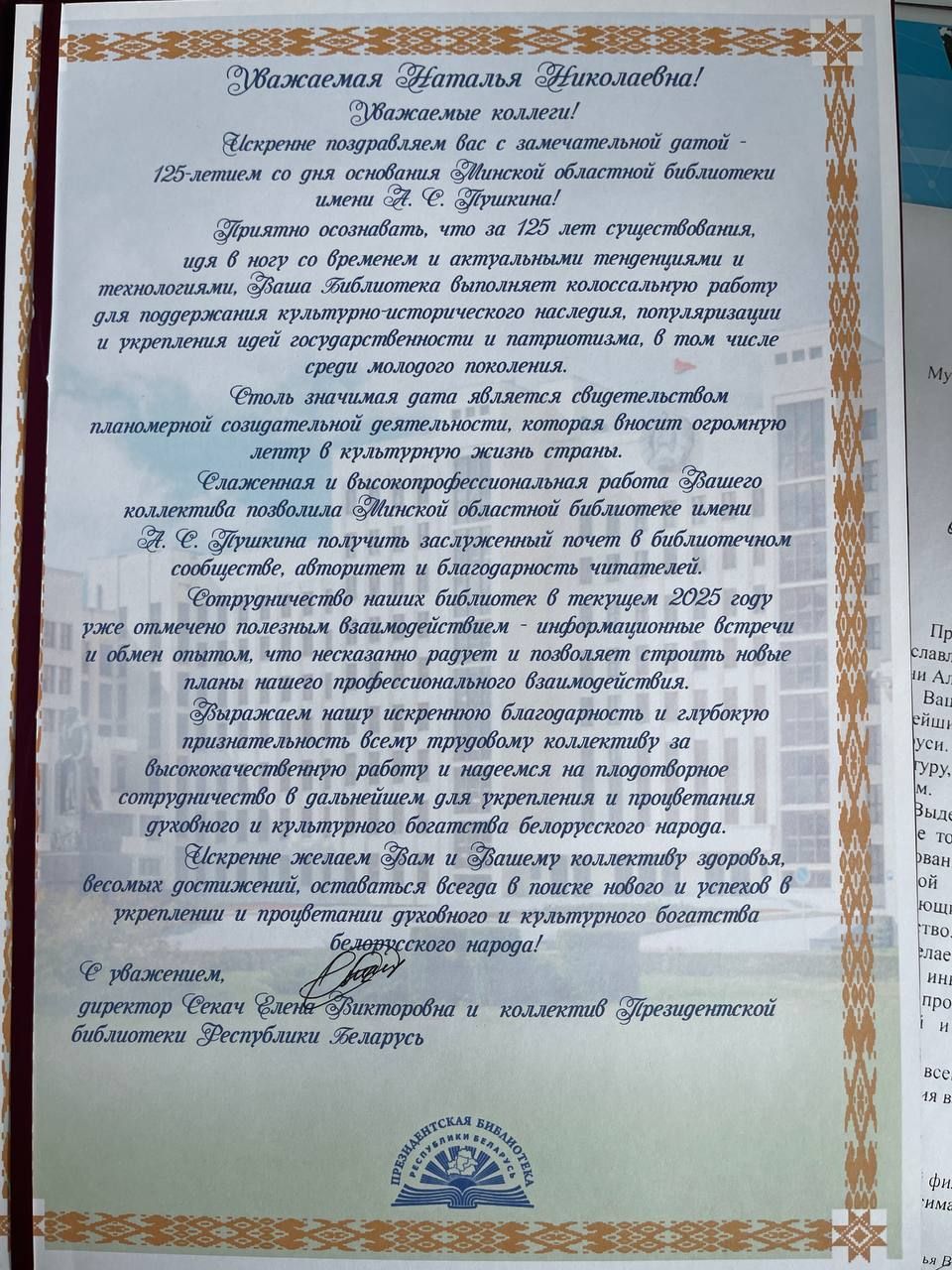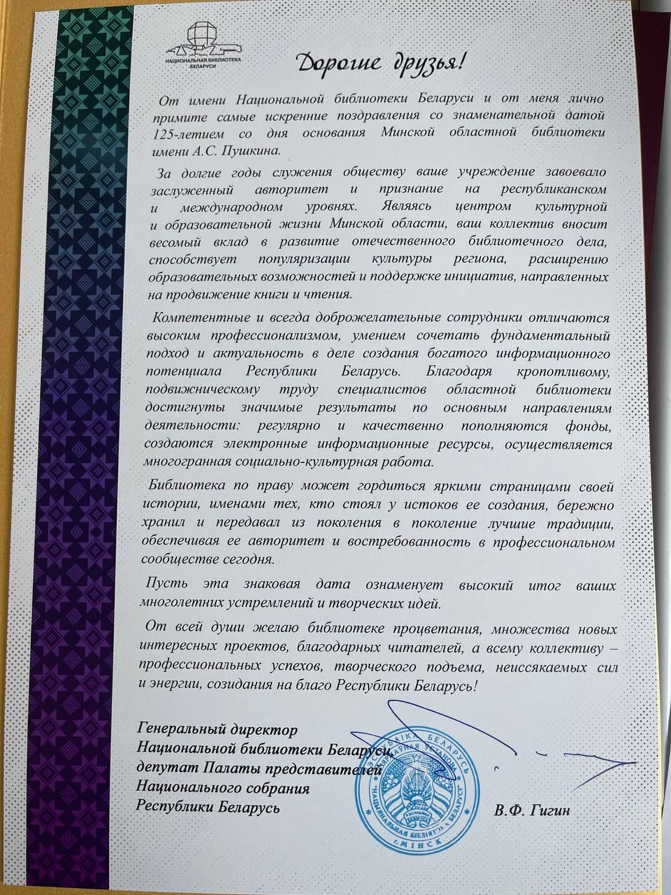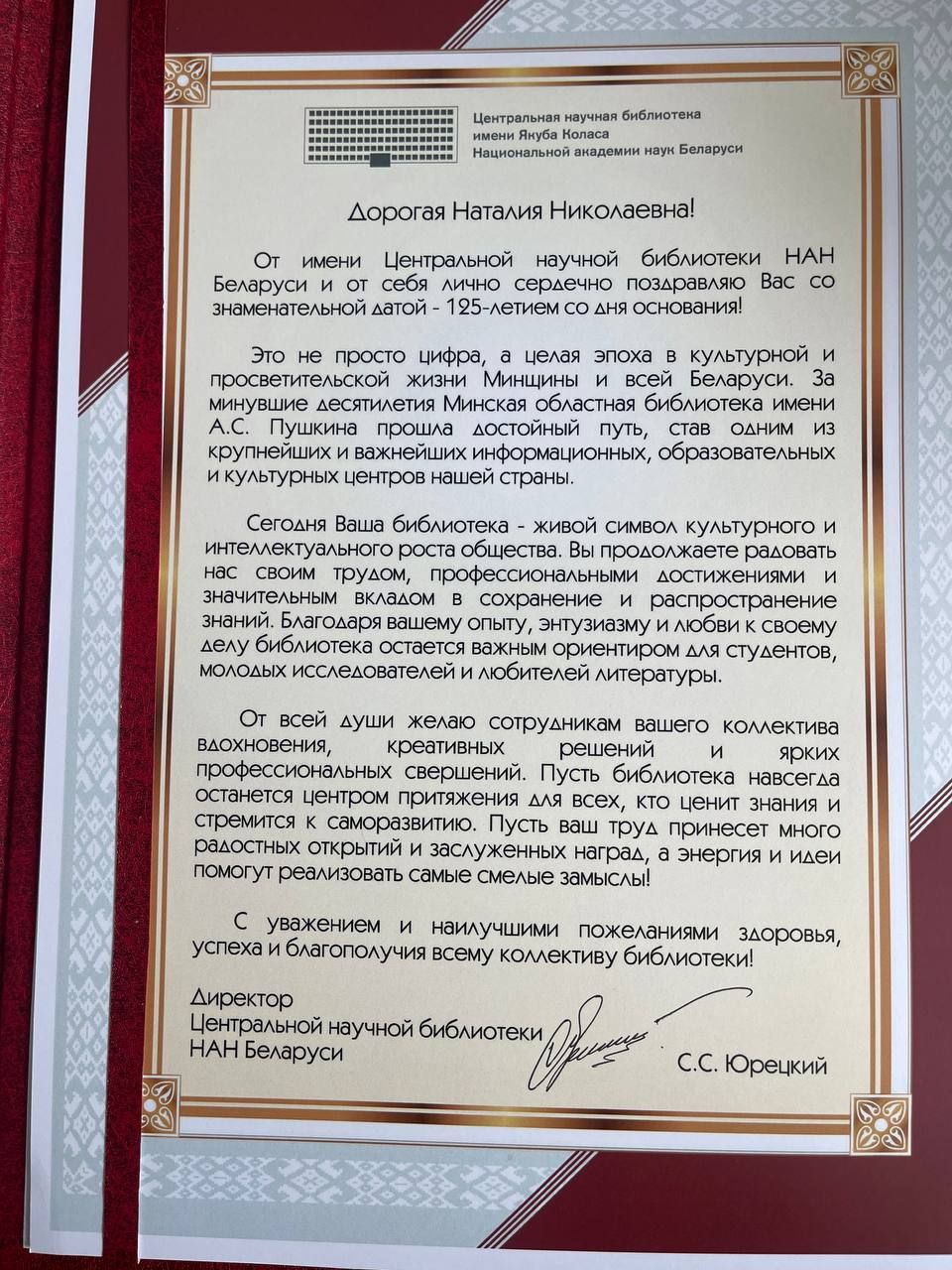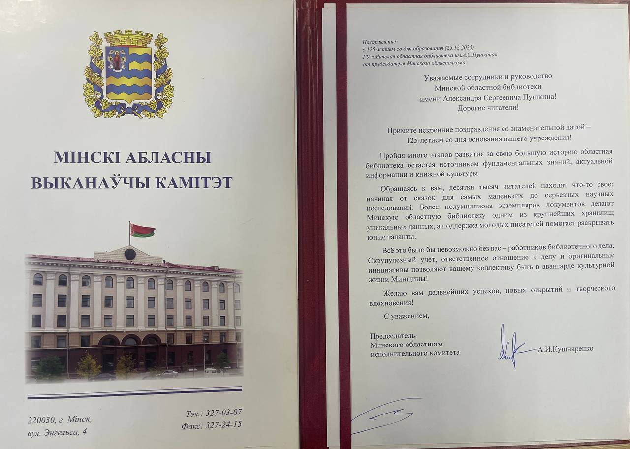 На имя директора ГУ «Минская областная библиотека им. А.С. Пушкина» поступили поздравительные адреса от: