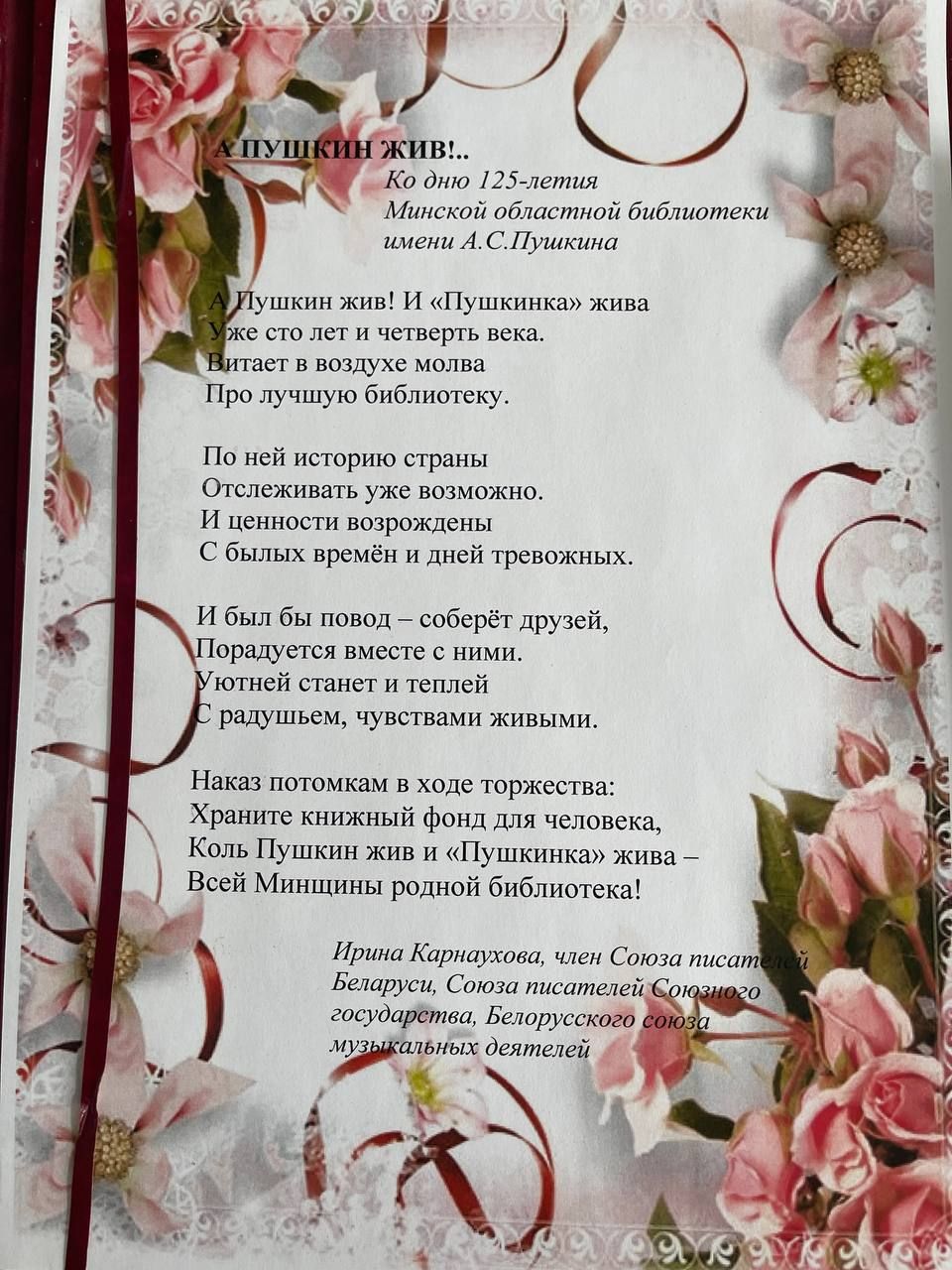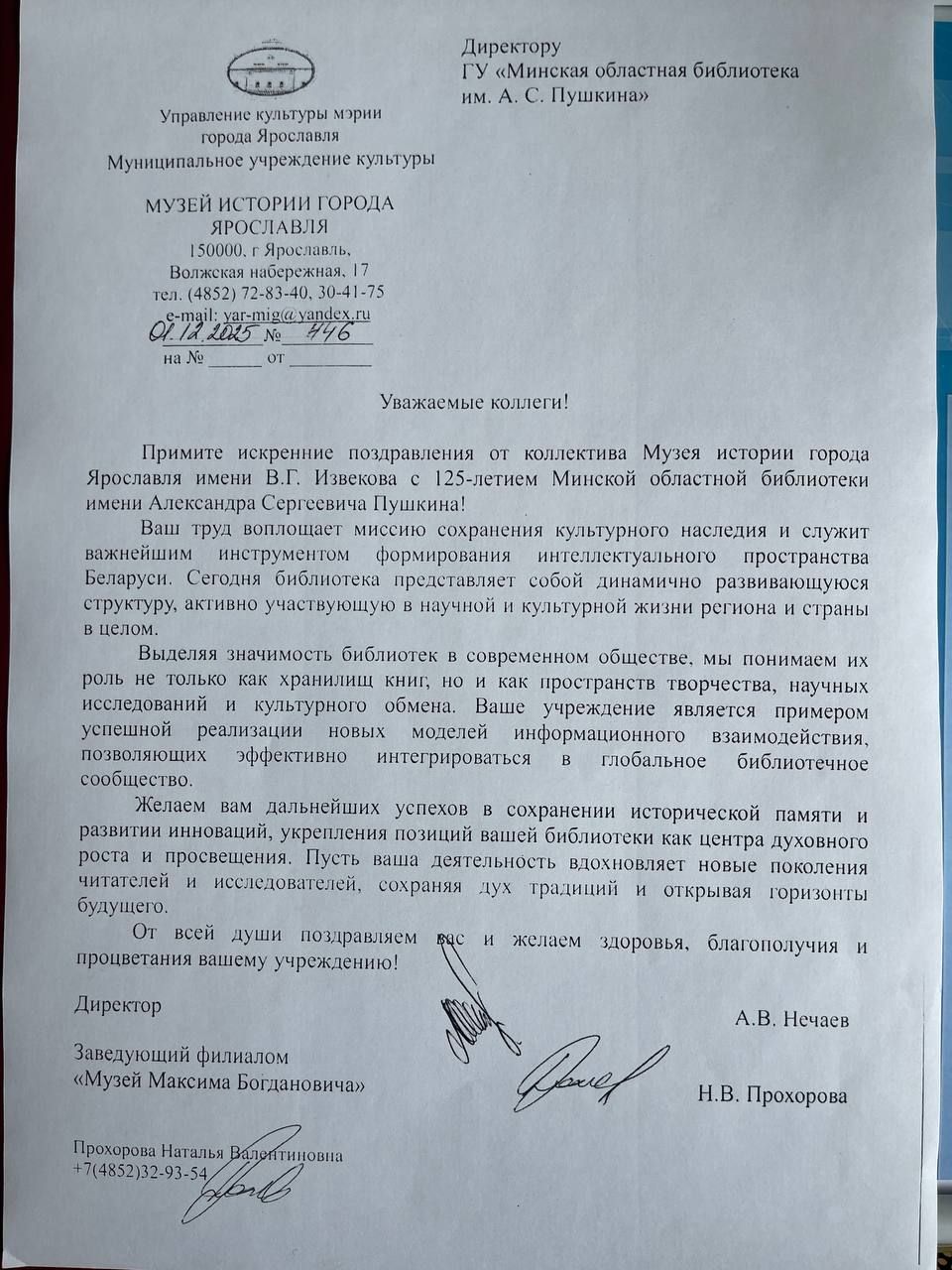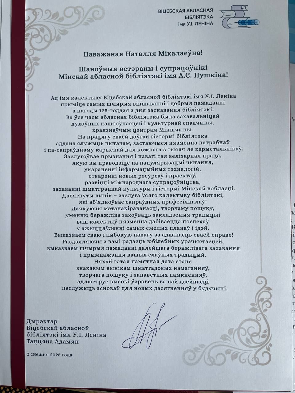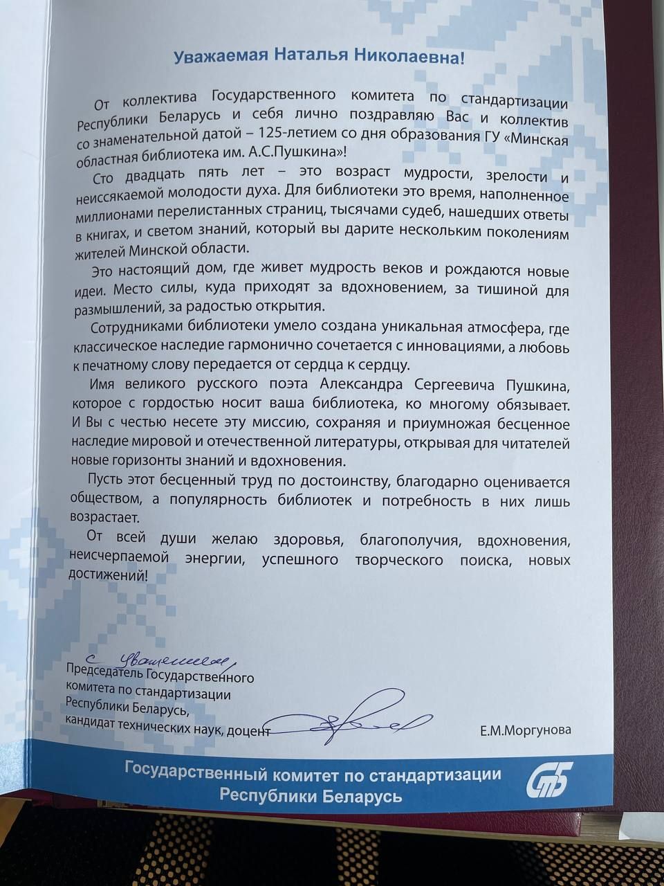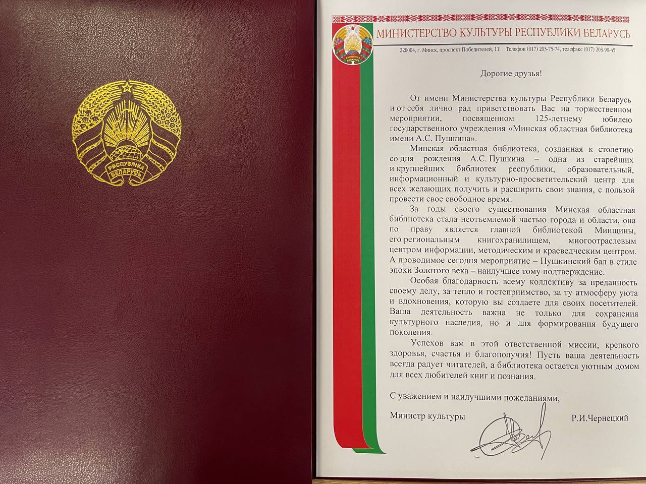 На имя директора ГУ «Минская областная библиотека им. А.С. Пушкина» поступили поздравительные адреса от: