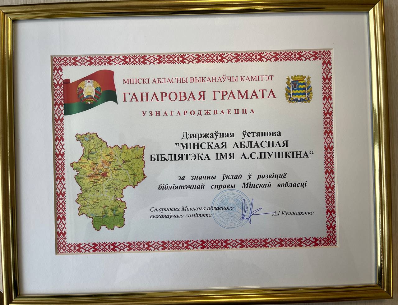 В ходе торжественной церемонии, которая состоялась 23 декабря 2025 года, ГУ «Минская областная библиотека им. А.С. Пушкина» награждена Почётной грамотой Минского областного исполнительного комитета за «значительный вклад в развитие библиотечного дела Минской области».