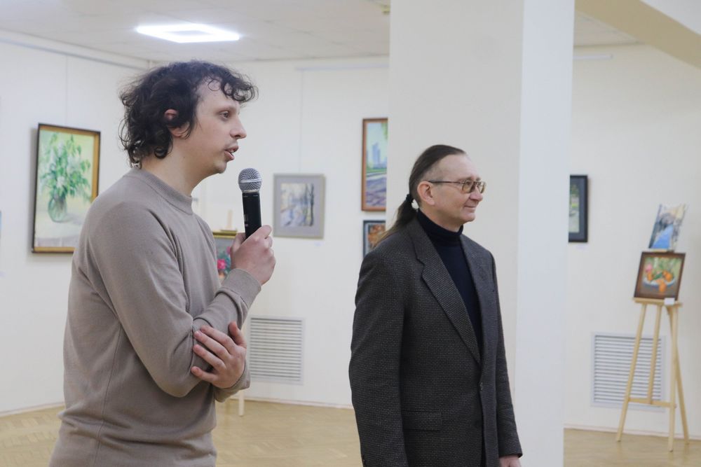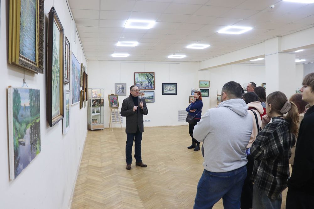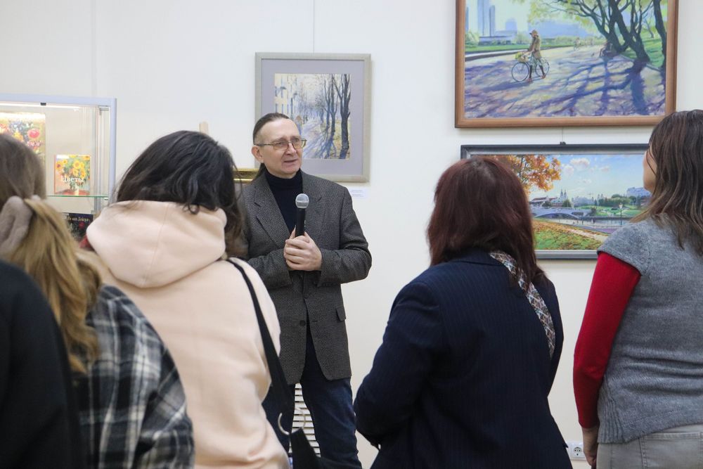 В рамках открытия своей персональной выставки художник провёл авторскую экскурсию по представленным работам. Гости мероприятия получили уникальную возможность «из первых уст» узнать о том, какие события нашли отражение в ярких и красочных полотнах. Юрий Лешик с удовольствием рассказал о своих многочисленных путешествиях, в том числе – в Крым, Польшу и Венецию, про участие там в пленэрах, о том, почему из всех времен года предпочитает зиму, а любимыми цветами считает пионы и сирень. Портреты в творчестве живописца занимают особое место, к ним Юрия Ивановича особое отношение. Автор выставки считает: чтобы портрет человека действительно получился, художник должен искренне полюбить своего героя. И Юрий Иванович поделился трогательной историей о мужчине, заказавшем детский портрет своей дочери – картина, к слову, стала основой для афиши настоящей экспозиции. Ещё одна занимательная история предшествовала работе «Девушка-весна», в которой художник запечатлел легко одетую девушку, прогуливающуюся по прохладному осеннему парку. В этом образе Юрий Иванович отобразил удивительную стойкость, оптимизм и жизнелюбие, которую сам живописец охарактеризовал ёмкой фразой – «Жить, несмотря ни на что».