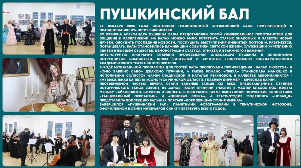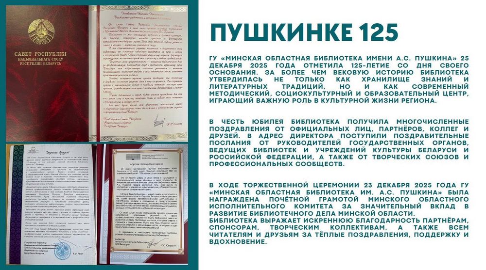 Центральным моментом встречи стала интересная презентация, приуроченная к 125-летнему юбилею Минской областной библиотеки им. А.С. Пушкина. Присутствующие смогли совершить виртуальное путешествие по страницам истории — от создания первой публичной библиотеки Минска в 1900 году до наших дней. На экране перед зрителями предстала богатая летопись Пушкинки, которая переплелась с современными страницами истории учреждения, сохраняющего традиции просвещения на протяжении более столетия. Директор Минской областной библиотеки им. А. С. Пушкина рассказала о том, что сегодня областная библиотека – это не только хранилище книг, но и активный социокультурный центр. Последние годы истории библиотеки ознаменовались яркими проектами, такими, как «Пушкинский бал», «Библионочь в Пушкинке», просветительский проект «Встретимся под часами». Здесь проводятся международные семинары, научно-практические конференции, творческие телемосты, литературные конкурсы, презентации книг и многое другое.