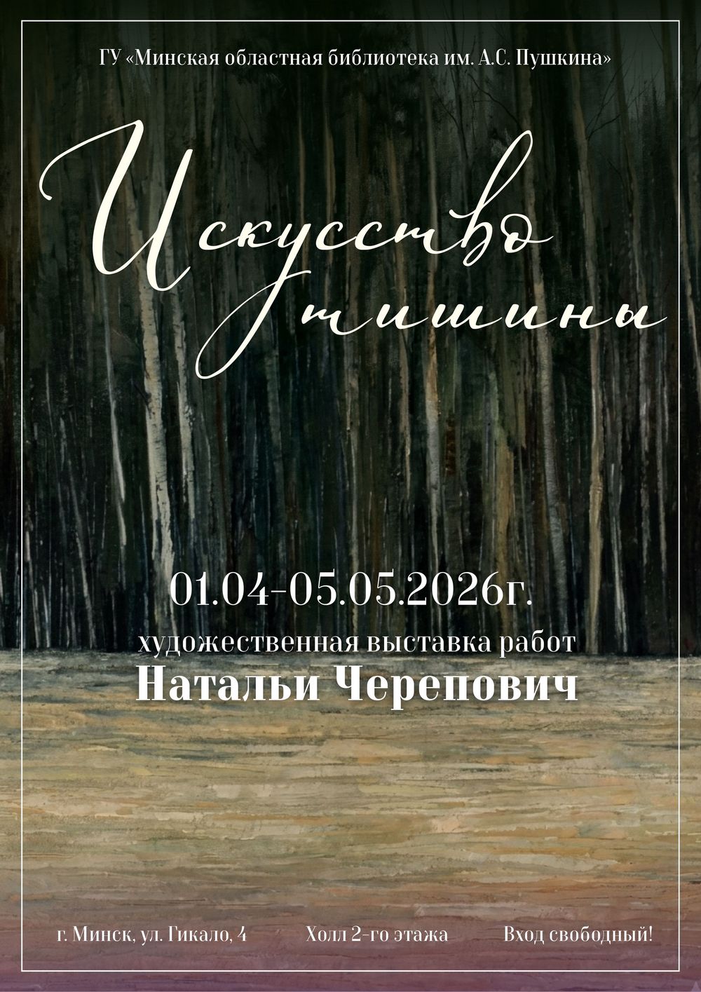 Открытие персональной выставки Натальи Черепович (Зуевской) «Искусство тишины» состоится 8 апреля 2026 года в 18:00 в Минской областной библиотеке имени А.С. Пушкина по адресу: ул. Гикало, 4 (холл второго этажа). Вход свободный.