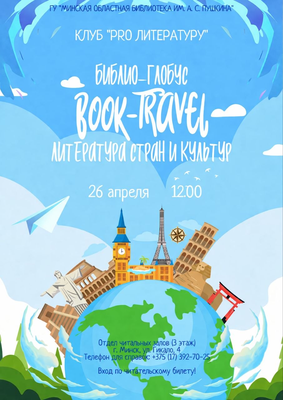 26 апреля 2026 года в 12:00 в отделе читальных залов ГУ «Минская областная библиотека имени А. С. Пушкина» состоится очередное заседание книжного клуба «PRO Литературу» – Библио-Глобус «Book-Travel. Литература стран и культур».